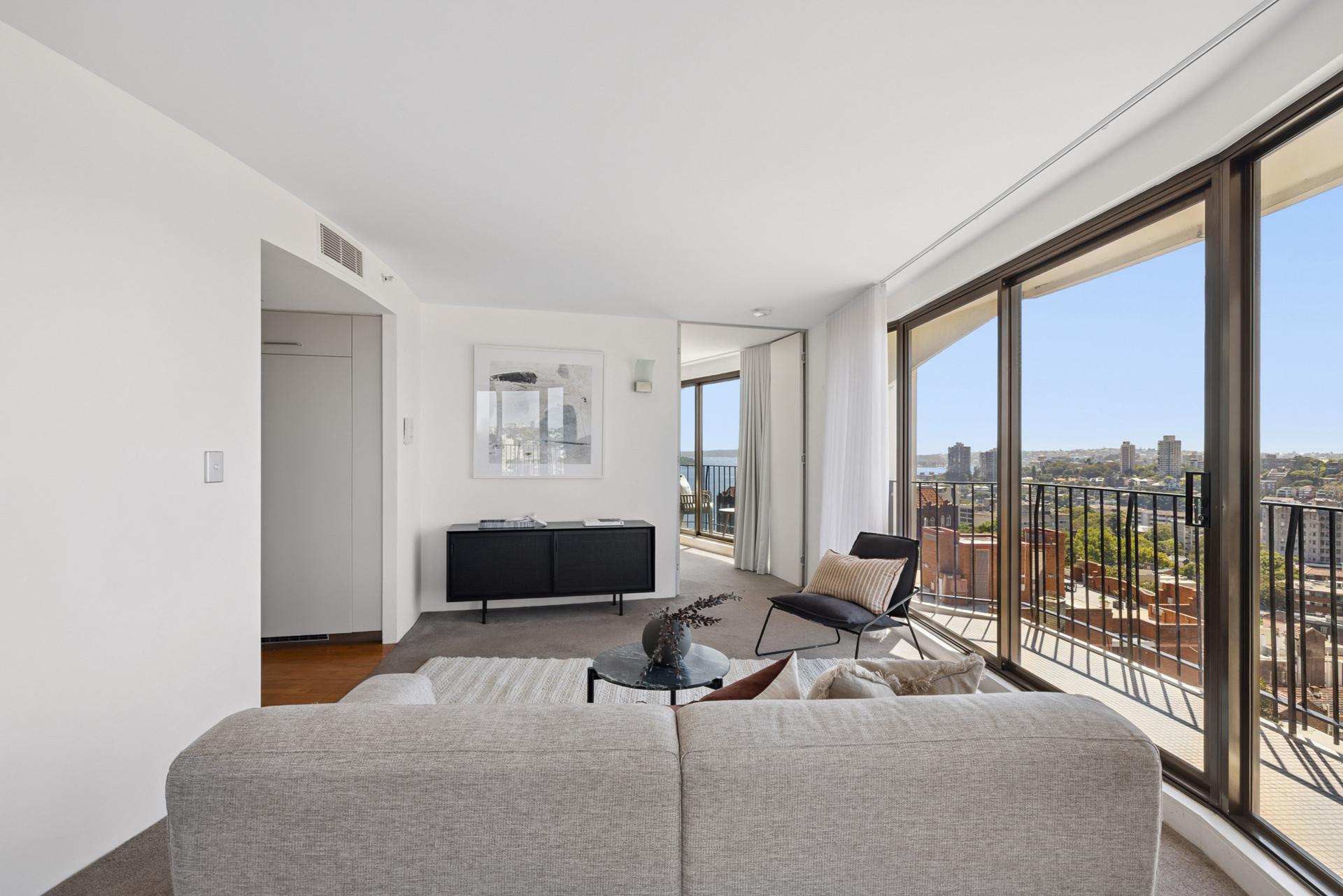 Within the prestigious ‘Gazebo’ tower, this apartment bears all the signatures that make this building such a Sydney icon: curved walls with large sliding glass doors and 4 consecutive balconies. From up here on Level 12, the spectacular vantage captures much of Sydney, including the sparkling harbour and many surrounding districts. For optimal privacy, two master-sized wings are placed at either end of the floorplan, each with ensuite bathroom and balcony. Enjoy hotel-style living and design cred in one of Sydney’s most recognisable architectural landmarks, with resort-style facilities in the building, fashionable dining, shops, transport at your doorstep, and the harbour and CBD just beyond. Free Strata Report available at bw.com.au.