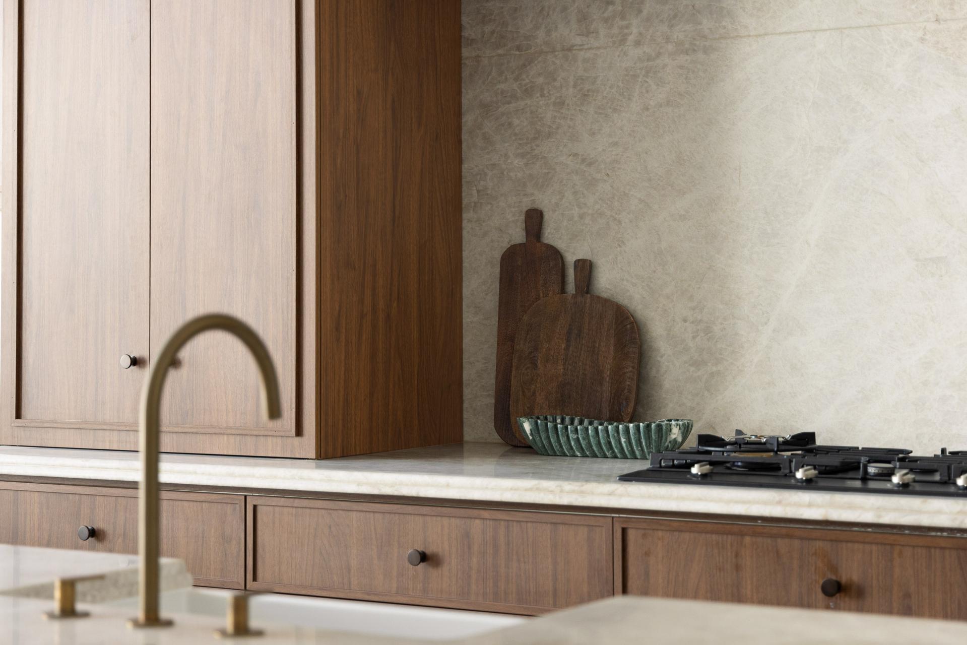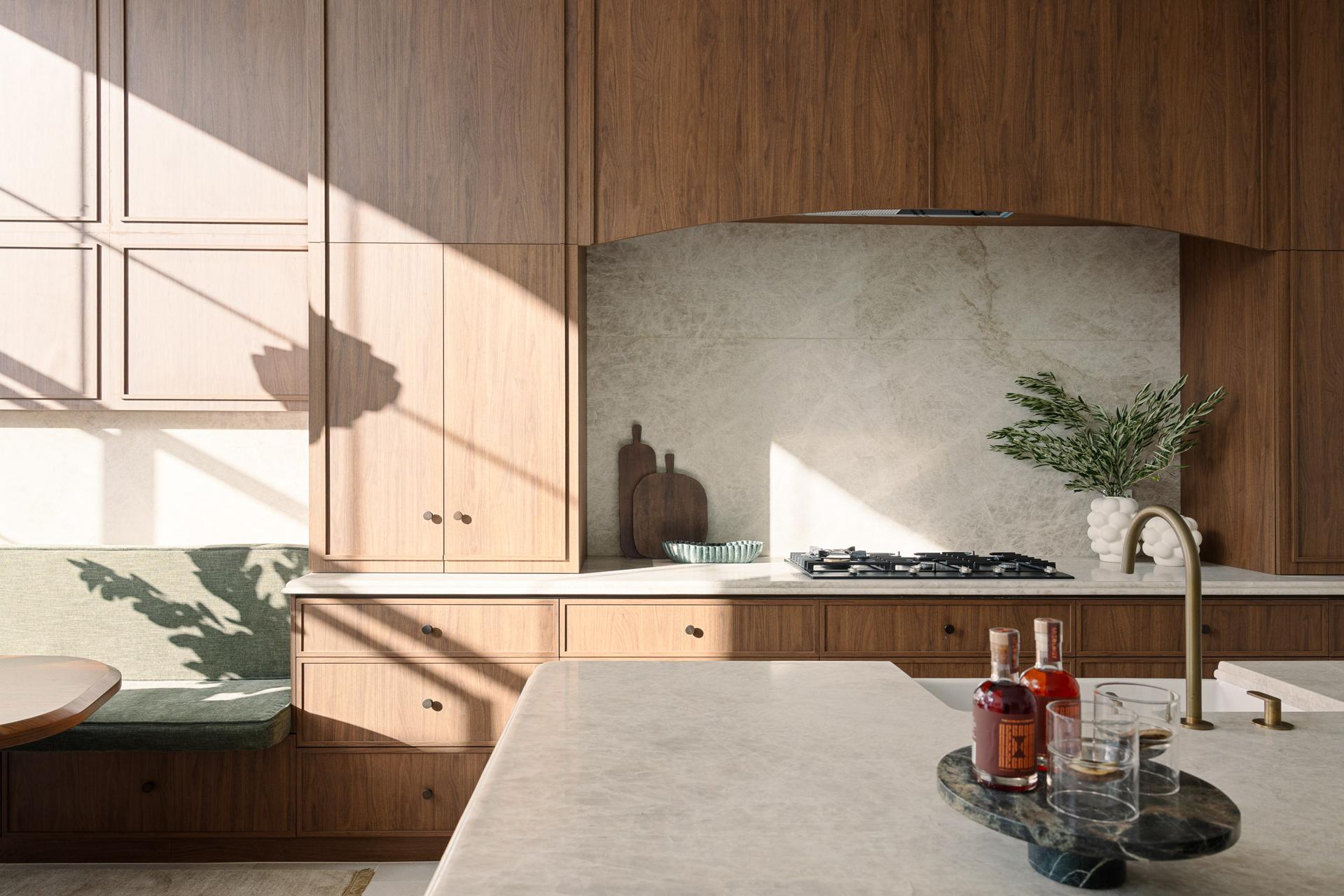 - Oversized marble island, gas cooktop
