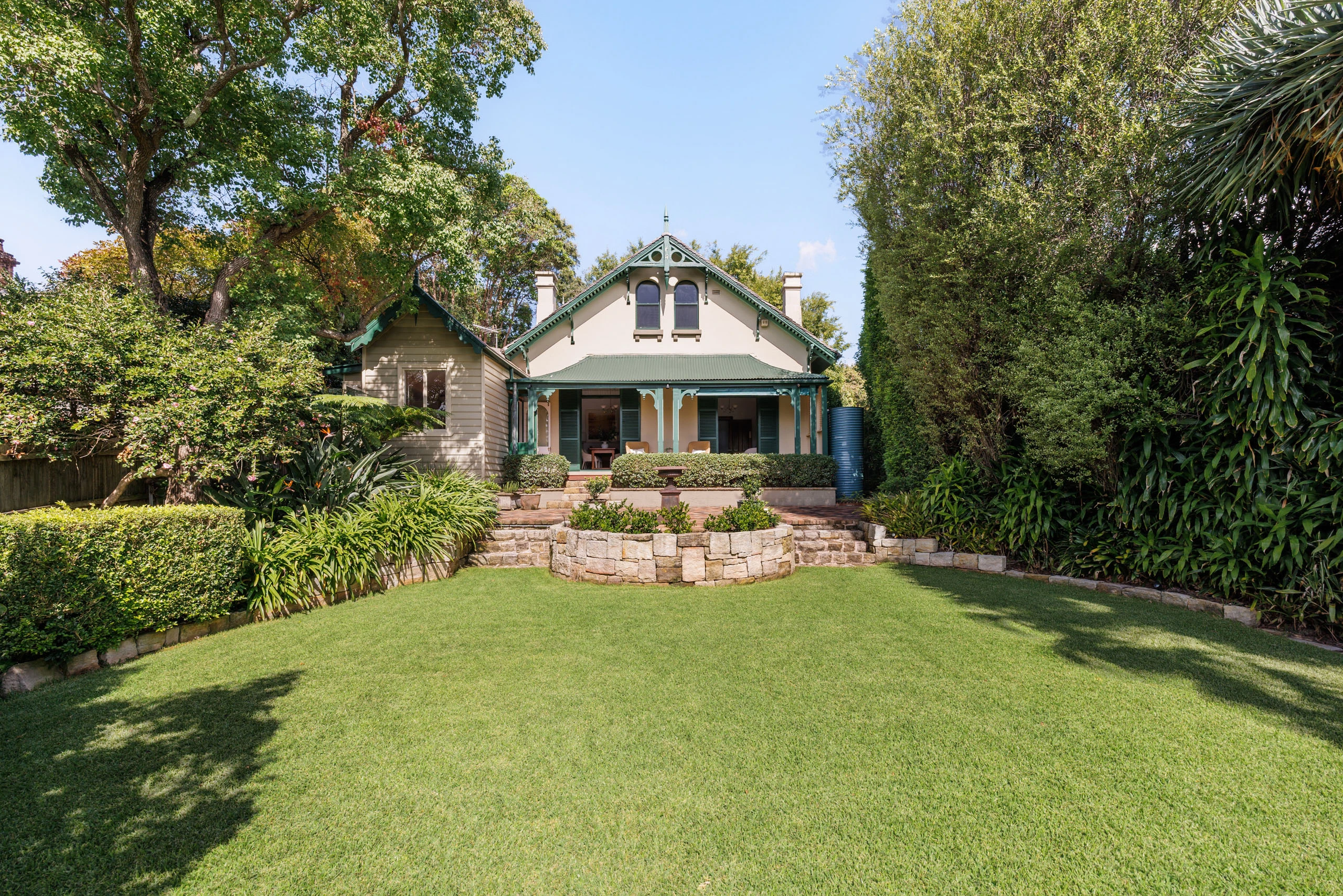 - Level lawn, paved stone entertaining areas