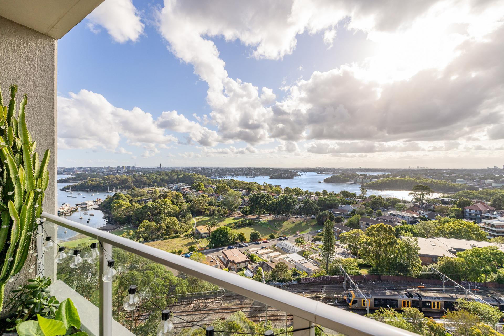 High up in the landmark building ‘Montevideo’, this apartment has spectacular water views capturing Berry Island, Greenwich, Balls Head, Anzac Bridge and surrounding districts. The generous floorplan includes two well-separated bedrooms, one with ensuite bath, and a built-in home office. The separate kitchen is modern and well-appointed, crowned by its own superb vantage over Sydney Harbour. The location puts you in the heart of a desirable Lower North Shore village hub, with Waverton Park and train station just outside, along with plenty of local cafés and dining spots. A low-maintenance home or investment in a sought-after harbourside locale. Stroll to Victoria Cross Metro Station, local schools, foreshore parks and attractions, and North Sydney CBD.