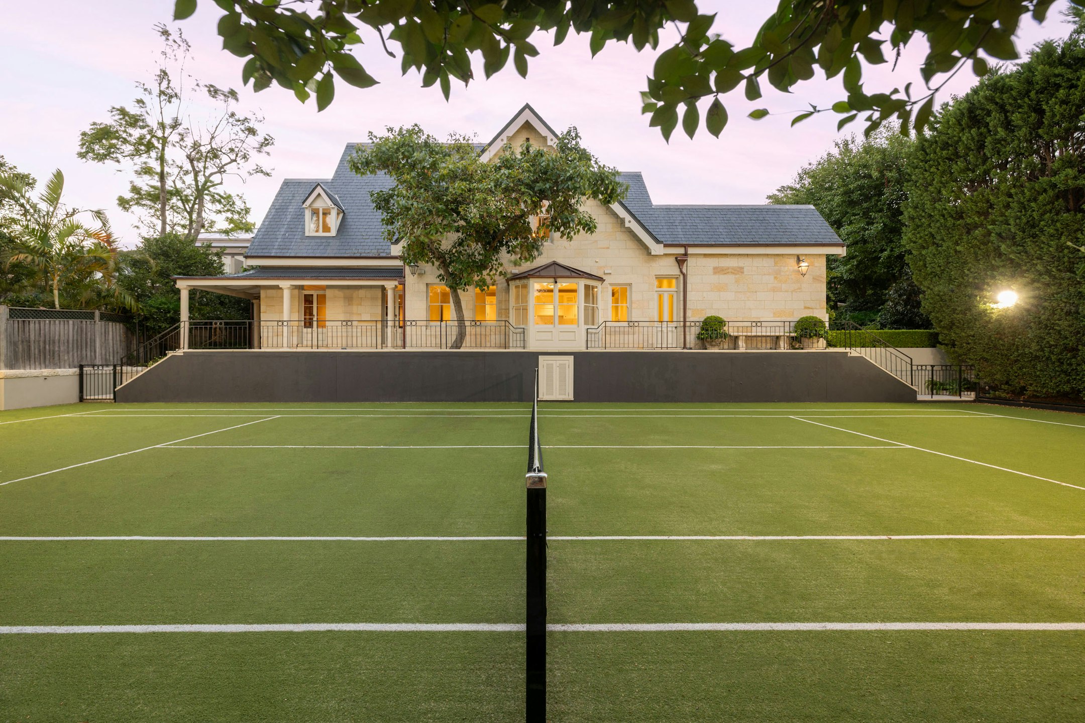 Set on a substantial north-east facing harbourside estate, the main residence is sandstone in Victorian Gothic style. Its scale, position and privacy on Kurraba Point place it among Sydney’s most valuable and tightly held properties. It presents as a ready-made home for contemporary living with resort-style amenities while retaining its architectural presence. The estate features a second residence overlooking the N/S tennis court, offering flexible accommodation for guests or multi-generational living. The third building contains a wellness retreat with gym, sauna, kitchenette and bathrooms overlooking the pool and spa, as well as four car garaging and a home office above. A private rear path to Bogota Avenue provides direct access to Cremorne Point Reserve and Shellcove beach, with views towards the Harbour Bridge and Opera House.